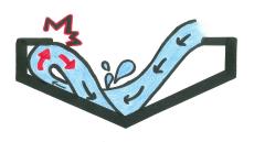 | 【水返しがある場合】 谷樋に流れ込んだ雨水は、水返しにぶつかり谷に戻ってきて、正しく流れていきます。 |